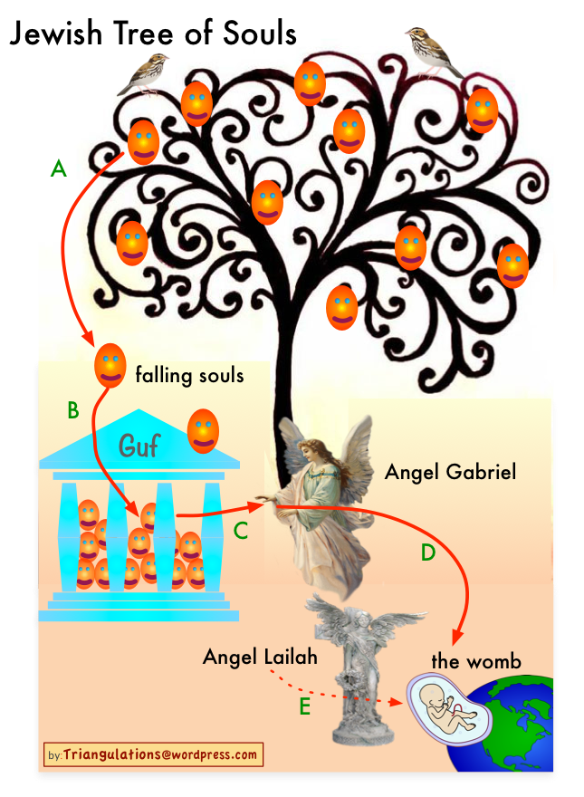 And in the Jewish legend of The Guf, the blossoms of the Tree of Life are souls, they ripen, then fall from the tree into the Guf, the Treasury of Souls in Paradise. The soul is stored there until the angel Gabriel reaches into the Guf and takes out the first soul that comes into his hand. (17)