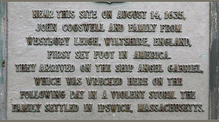 John Cogswell was considered one of the principal passengers. He was from Westbury Leigh, Wiltshire, England. His occupation in England was noted in some records as a “clothier” and that he was a London merchant. He was a man of wealth and standing, married to Elizabeth Thompson, a daughter of the Vicar of Westbury parish. John Cogswell left a very comfortable existence in England to come to America. They embarked with eight of their nine children on the Angel Gabriel accompanied by his servants and many of their belongings bound for the new settlement at Ipswich. It is recorded that he had with him “…several farm and household servants, an amount of valuable furniture, farming implements, housekeeping utensils, and a considerable sum of money…