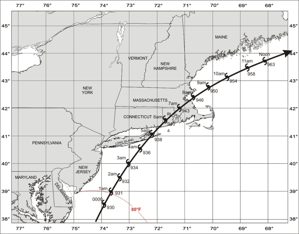 Likely track of the Great Colonial Hurricane of August 26, 1635, with hourly positions and central pressure in millibars. Source: Atlantic Oceanographic and Meteorological Laboratory