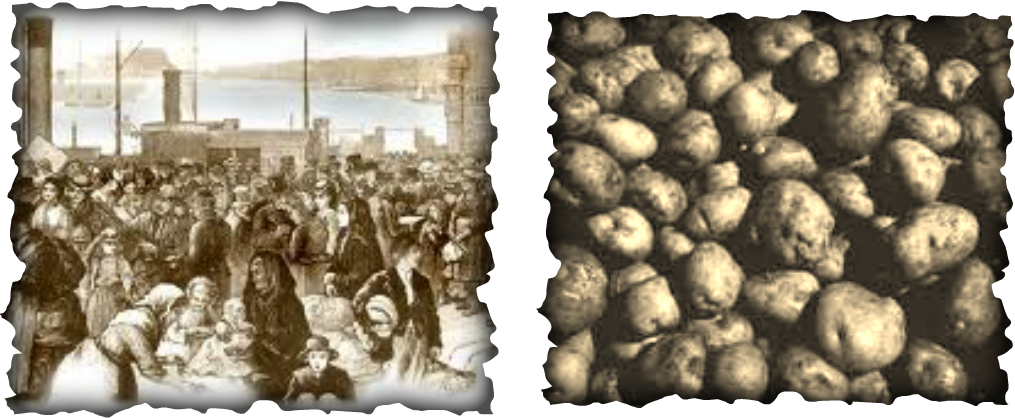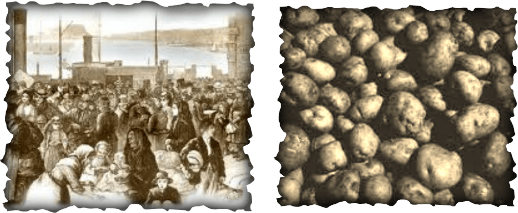 Most people in America with Irish ancestors are familiar with the horrific tragedy of the Irish Potato Famine years. The Great Famine (Irish: an Gorta Mór) also known as the Great Hunger, the Famine (mostly within Ireland) or the Irish Potato Famine (mostly outside Ireland) was a period of mass starvation and disease in Ireland from 1845 to 1852. With the most severely affected areas in the west and south of Ireland, where the Irish language was dominant, the period was contemporaneously known in Irish as an Drochshaol, loosely translated as “the hard times” (or literally “the bad life”). The worst year of the period was 1847, known as “Black ’47”. During the Great Hunger, about 1 million people died and more than a million fled the country, causing the country’s population to fall by 20–25%, in some towns falling as much as 67% between 1841 and 1851. Between 1845 and 1855, no fewer than 2.1 million people left Ireland, primarily on packet ships but also steamboats and barks—one of the greatest mass exoduses from a single island in history. (1, 2, 3, 4, 5, & 6).