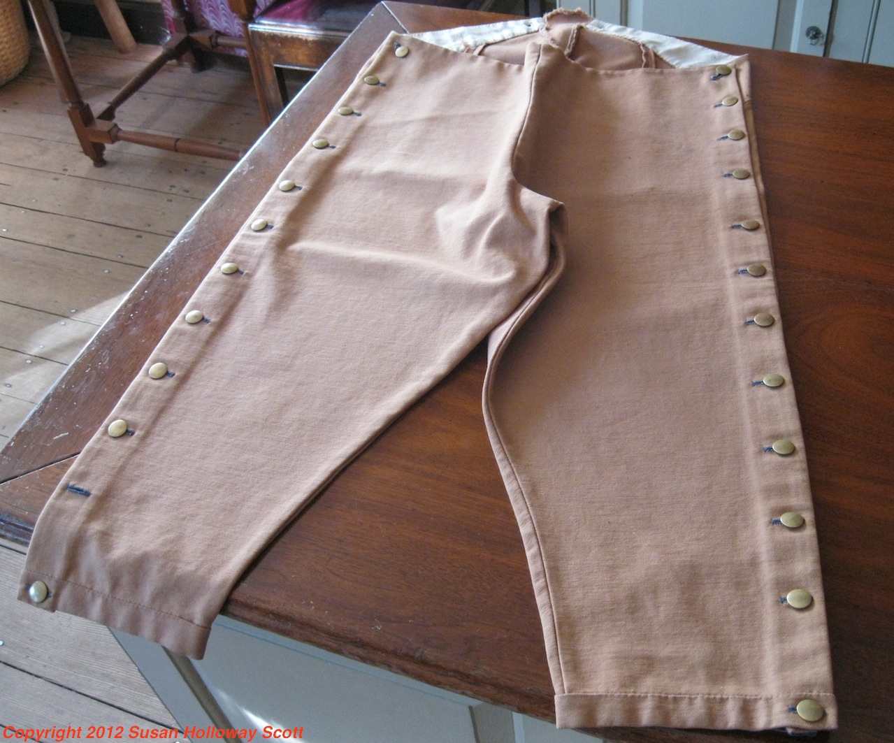 So, what were sherryvallies exactly? They were thick, loose riding-trousers, fastened on the outside of each leg. They could be trousers or overalls and made of heavy linen, cotton or even leather, they buttoned on the outside of each leg. They were worn over breeches and stockings to protect these clothes from dust and mud encountered when horseback riding. It also protected the clothing from the smell of leather and horse. Similar to an overcoat, it would be removed once the rider arrived at their destination. Sherryvallies were worn by both the well-to-do and the poor. (4 & 5) They remind me of chaps worn by cowboys and ranchers.