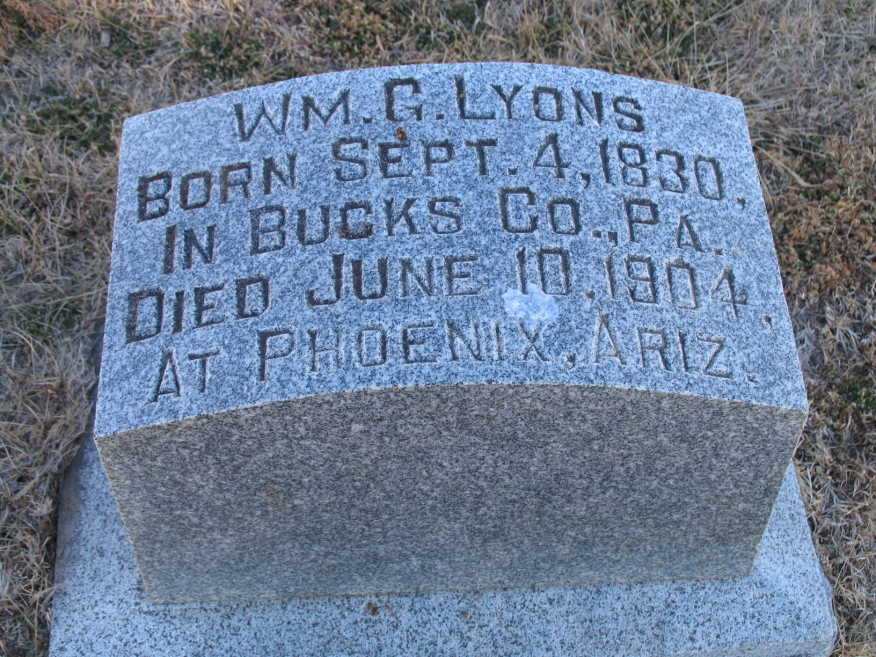 - William G. Lyons born 4 September 1830 in Falls, Bucks County, Pennsylvania, and died 10 June 1904 in Phoenix, Maricopa, Arizona. He never married.