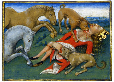 Shocked by this blatant crime, Yahweh’s prophet Elijah pronounced a curse on Ahab and his house. His prophecy was fulfilled: Ahab would be killed during another campaign against his old Syrian foe, while his son Ahaziah would die after a fall from his window. Ahab’s second son Jehoram was then ousted from the throne in a bloody coup by a commander named Jehu, reportedly with Elijah’s assistance, while Queen Jezebel was thrown out a window to her death and her blood spattered on the wall and horses. Jehu trampled her body under the horses’ hooves. (II Kings 9:6-10; 30-37) (1, 3 & 4)