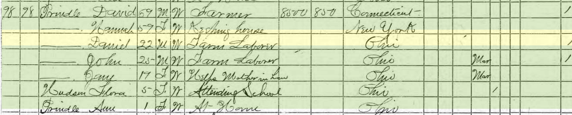 Researching my Doman ancestors has been a bit of a headache for some decades now. Firstly, my great-grandmother pictured above was born a year before her parents married, but DNA has confirmed that she was a full sibling to all the children born after the marriage of her parents, and it also confirmed that we are descendants of both the Prindle and Doman families. In the 1870 Census for Scioto, Pickaway, Ohio, it shows Sarah Jane “Jennie” Doman Prindle living in the household of her Prindle in-laws. She and Daniel had married on 7 November 1869 in Pickaway County, Ohio. Just to confuse things further the census-taker recorded her directly below Daniel’s brother John Prindle and incorrectly listed John Prindle and Jane Prindle (Sarah Jane) as married! My great-grandmother Anna Prindle is found on the bottom line directly below her cousin Flora Hudson. The two grandchildren, Flora and Anna listed together.