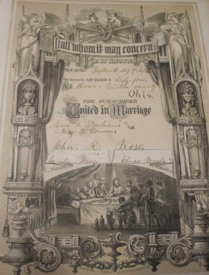 Marriage Certificate between Mary L. Doman and Amos Stoneburner.