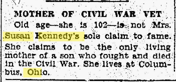 At the age of 102, it was written in a newspaper article about her that she claimed to be the oldest living mother of a son who fought and died in the US Civil War. Her oldest child, a son, John Davis Kennedy, Jr. fought and died in the Civil War on the Union side.