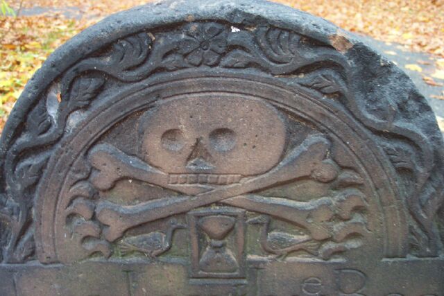 Her brown sandstone grave marker was carved by a craftsman whose name is not known. He was only known as The Old Elizabethtown Soul Carver I. He was active during the 1720’s-30’s. His work is distinguished by highly detailed mortality imagery. This includes the use of skull-with-crossbones soul effigies. Her gravestone shows the Puritanical emphasis on the brevity and fragility of life on earth. The harsh Puritan imagery often included skulls and crossed bones. They also included winged death’s heads and the accouterments of the grave, like the casket or coffin. Burial instruments, like the pick and ax, were also common. Nevertheless, the combination of the cross bones effigy together with an hourglass flanked by doves, is a rarely seen arrangement of symbols. Birds have universally been used to represent spirituality since ancient times. In medieval Europe, the dove represented the Holy Spirit and peace, often appearing in religious art and literature. The peacock, with its resplendent feathers, was a symbol of immortality and resurrection, often found in Christian iconography. In Colonial America, a bird in vines symbolized the soul partaking of celestial food. The dove was a Christian icon of constancy and devotion. To the Puritans the vine also represented fruitfulness, the vine providing refreshment and gladness. The hourglass served as a stark reminder of the shortness of life and the inevitability of death. (1, 2, 3, 4, & 5)