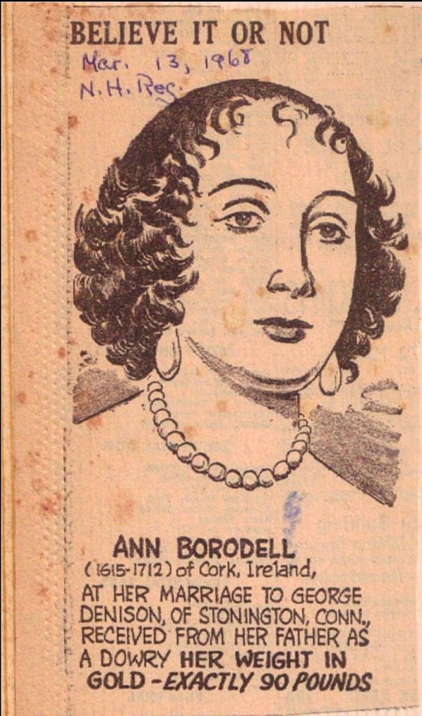 In her own lifetime, Ann (Borodell) Denison left little impression on the historical record. And yet, she has since become one of the more lavishly mythologized figures in the history of New England. How many colonials can boast a 1968 “Ripley’s Believe it or Not” newspaper blurb carried in forty-two countries? In many nineteenth-century sources, she’s “Lady Ann,” the daughter, variously, of an Irish lord, a soldier in Cromwell’s army, a leather merchant, or a cordwainer. (1)