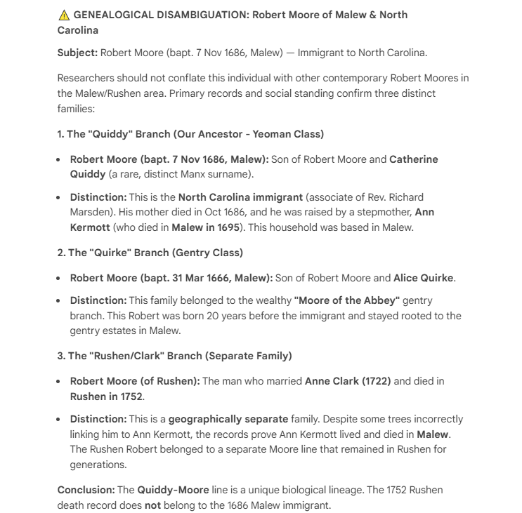 The glaring mistake here was not utilizing the records that we do have about Robert Moore’s origins. In several historical sources, it clearly states that Robert Moore was from the Isle of Man, set sail from there with Rev. Richard Marsden and they came together to North Carolina in 1706.