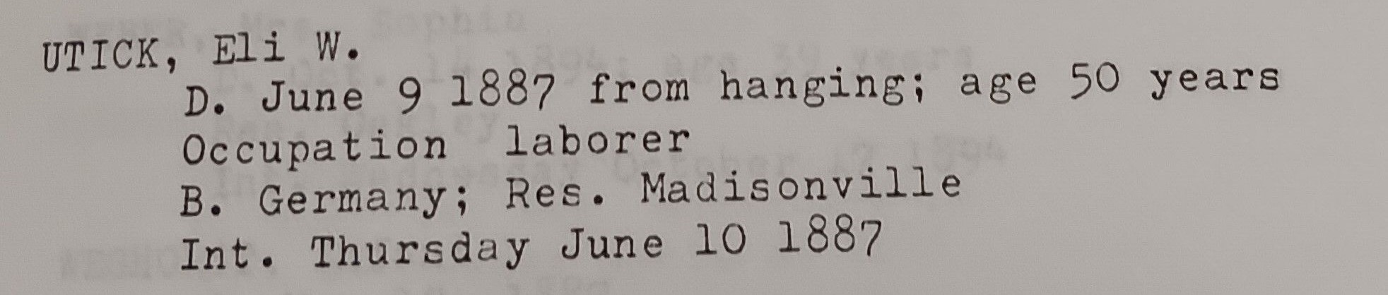We do learn from the cemetery record that his middle name began with the letter W. That he was 50 years old at the time of his death, putting his year of birth as 1837, or possibly 1836 if his birthday was in the second half of the year. He was a laborer, born in Germany. His residence at the time of his death was Madisonville. He died 7 June 1887 from hanging and was buried three days later on the 10th of June.